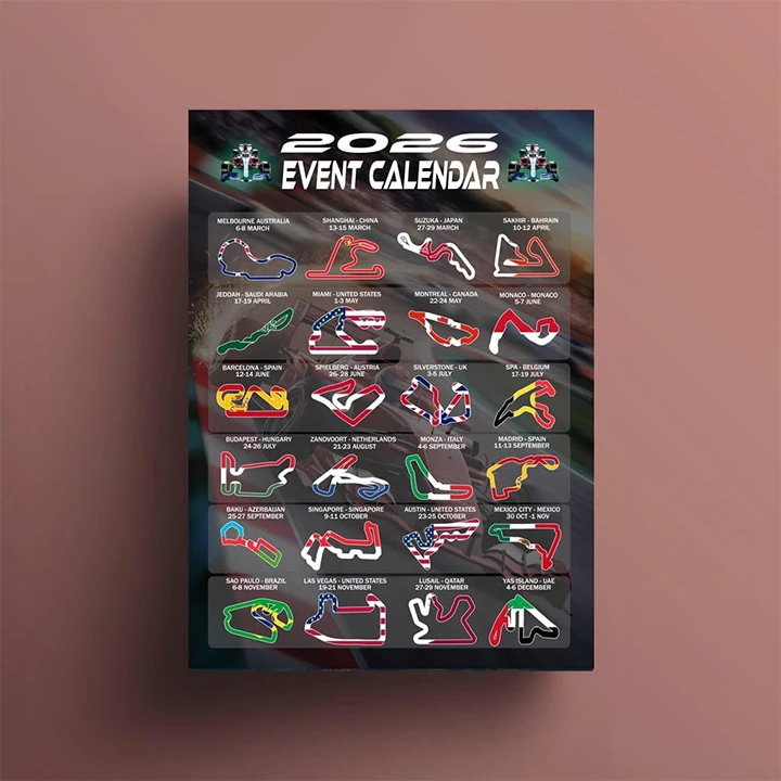 Follow the entire Formula 1 season with this 2026 wall calendar , bringing together all the iconic Grand Prix and circuits in a clear and visual format.